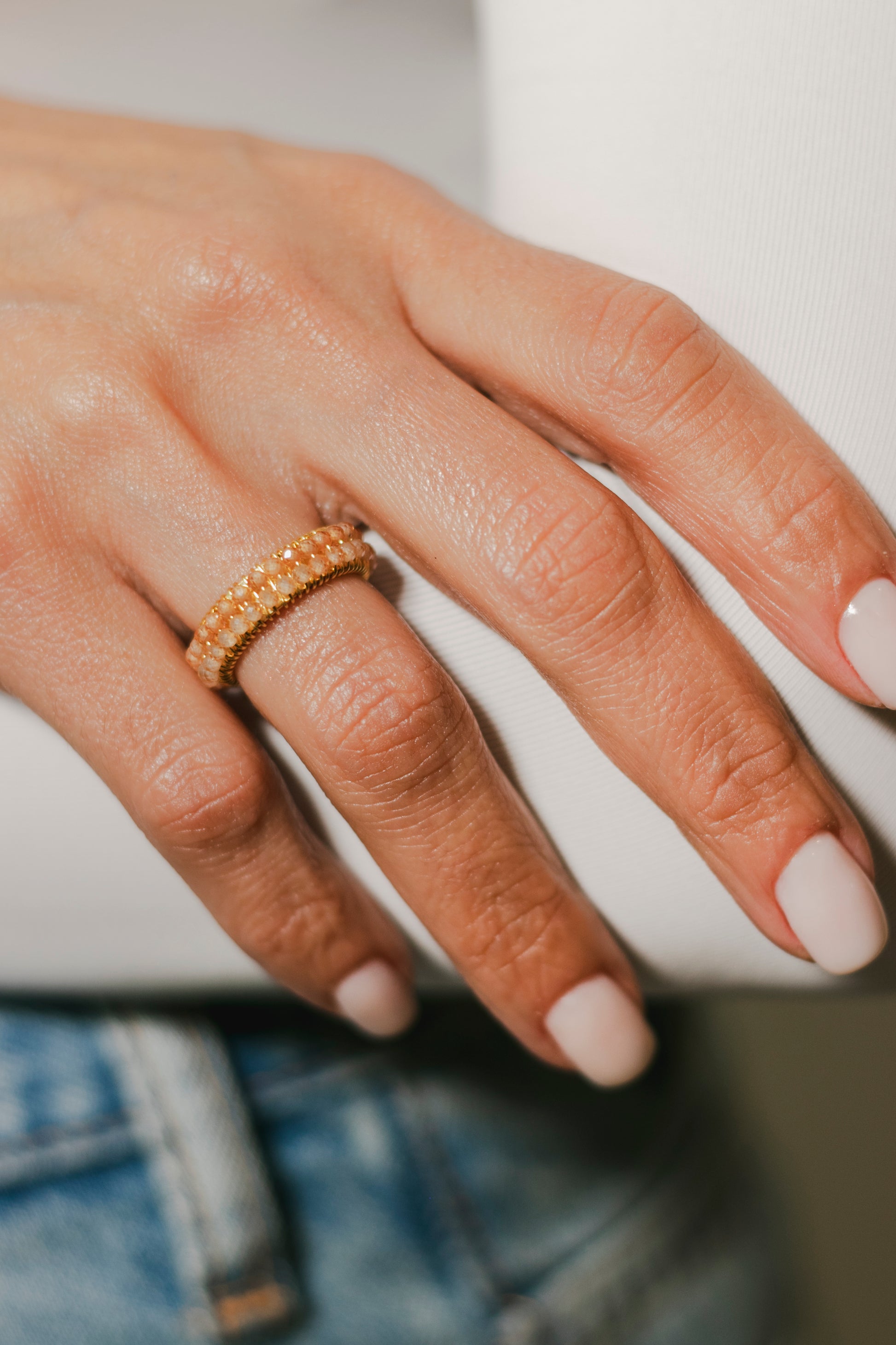MONTURA EN BRONCE BAÑADO EN ORO DE 14K. ORNAMENTADA A MANO CON CRISTALES/ PIEDRA SEMI PRECIOSA.