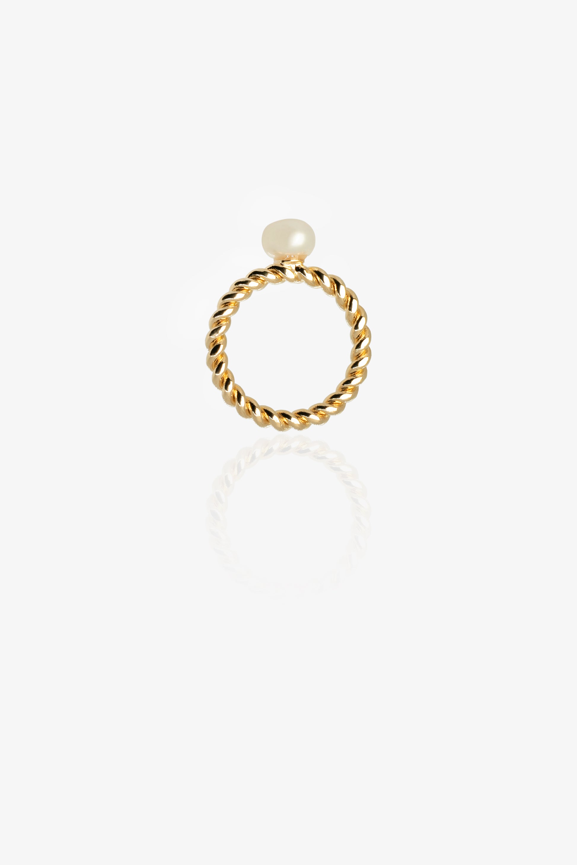 ANILLO TRENZADO A MANO ELABORADO EN BRONCE BAÑADO EN ORO DE 14K. COLECCIÓN INSPIRADA EN EL TEJIDO DE LA FIBRA NATURAL CON PERLA NATURAL CULTIVADA.