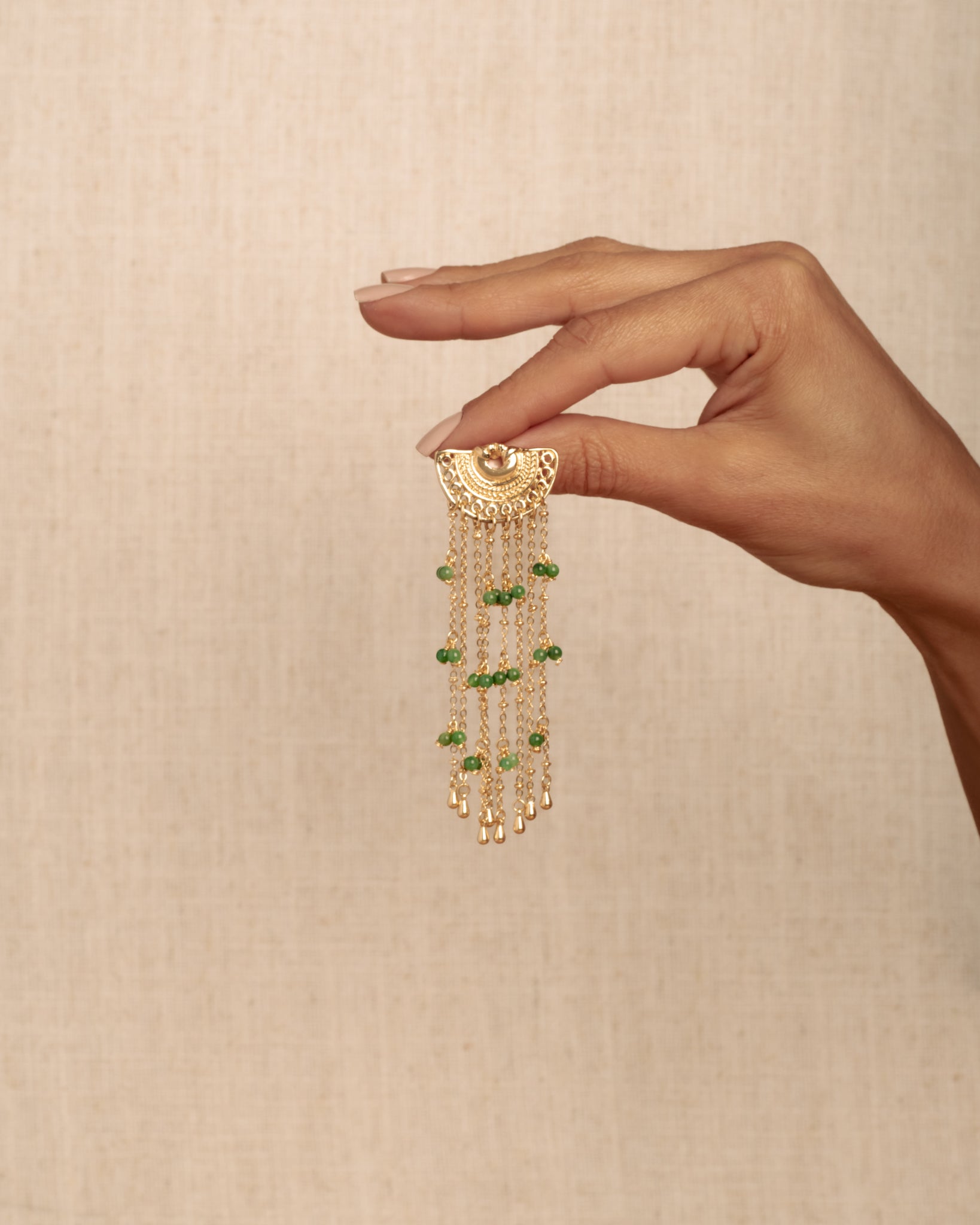 INSPIRADO EN ARTE PRECOLOMBINO. HECHO EN BRONCE BAÑADO EN ORO DE 14K. CON PIEDRAS ENGARZADAS A MANO.