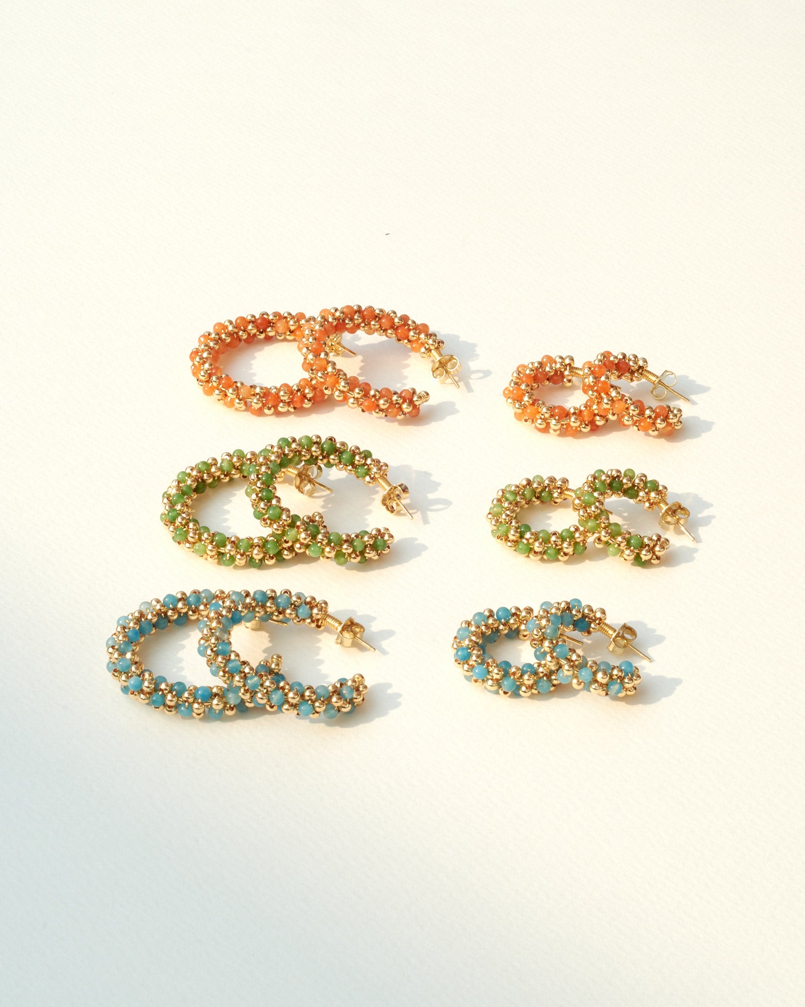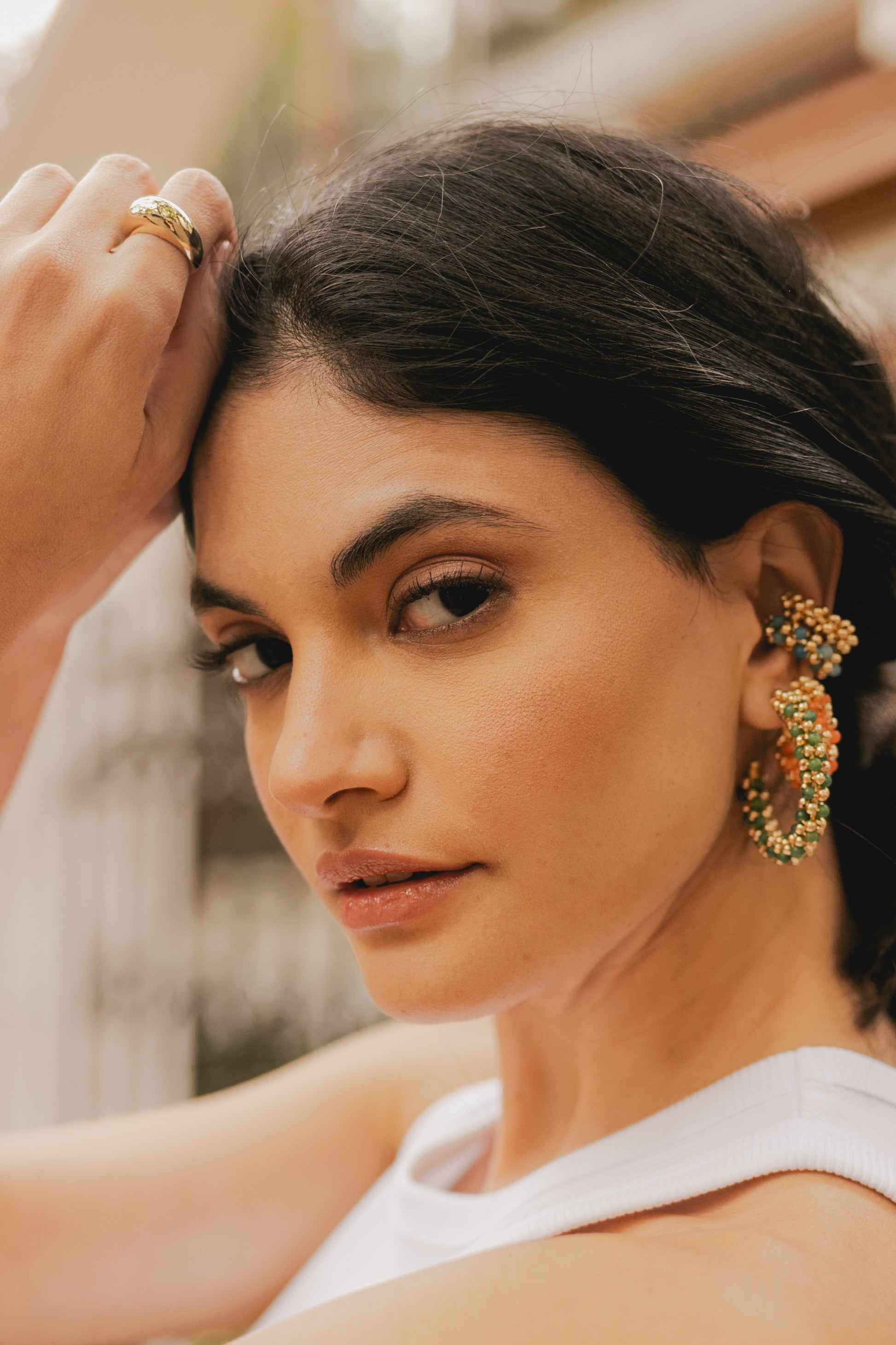 ARO EN BRONCE BAÑADO EN ORO DE 14K. BORDADO A MANO CON CUARZOS Y ESFERAS BAÑADAS EN ORO, COLECCIÓN INSPIRADA EN LA PLANTA DE AMARANTO.