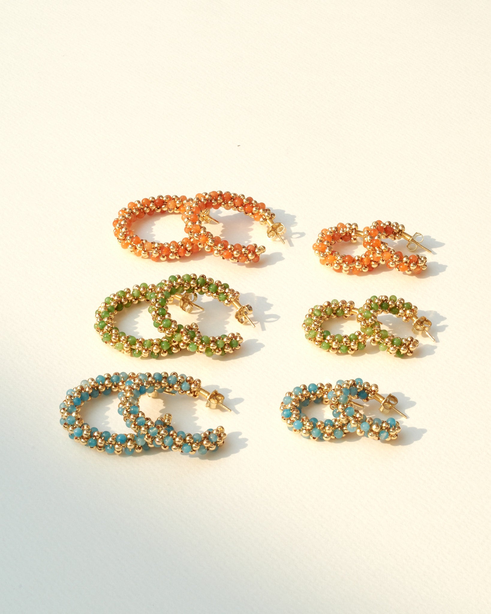 ARO EN BRONCE BAÑADO EN ORO DE 14K. BORDADO A MANO CON CUARZOS Y ESFERAS BAÑADAS EN ORO, COLECCIÓN INSPIRADA EN LA PLANTA DE AMARANTO.
