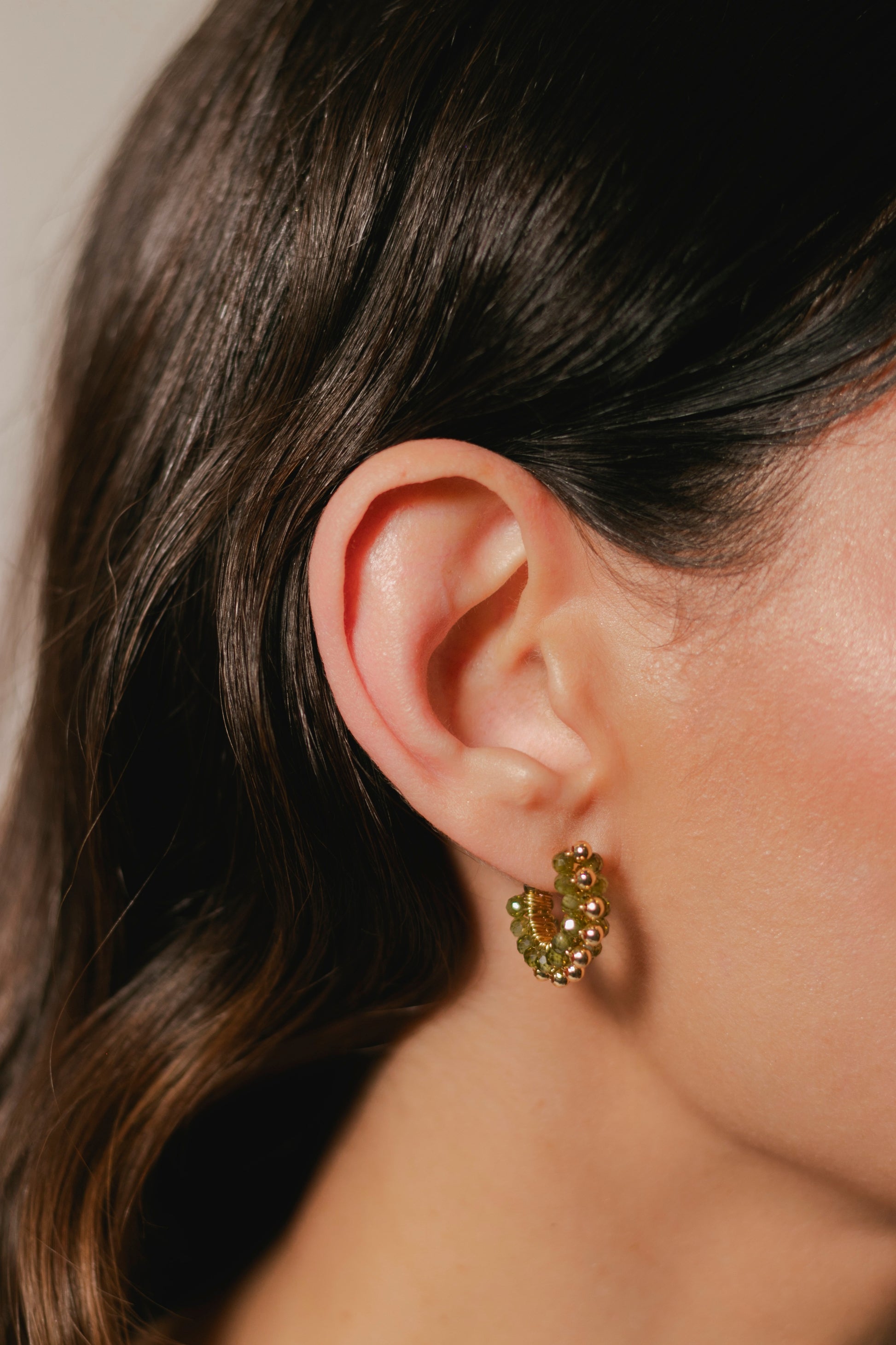 ARO HECHO EN BRONCE BAÑADO EN ORO DE 14K, TEJIDO A MANO CON PIEDRA SEMI PRECIOSA, PERIDOTO.