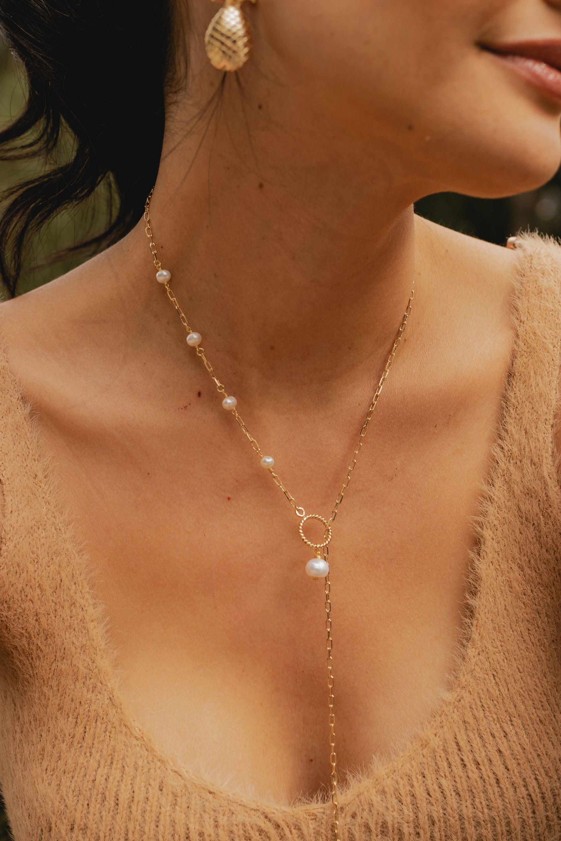 CADENA ELABORADA EN BRONCE BAÑADA EN ORO DE 14K. ARO TEJIDO A MANO INSPIRADO EN LAS FIBRAS NATURALES, ORNAMENTADA CON PERLAS.