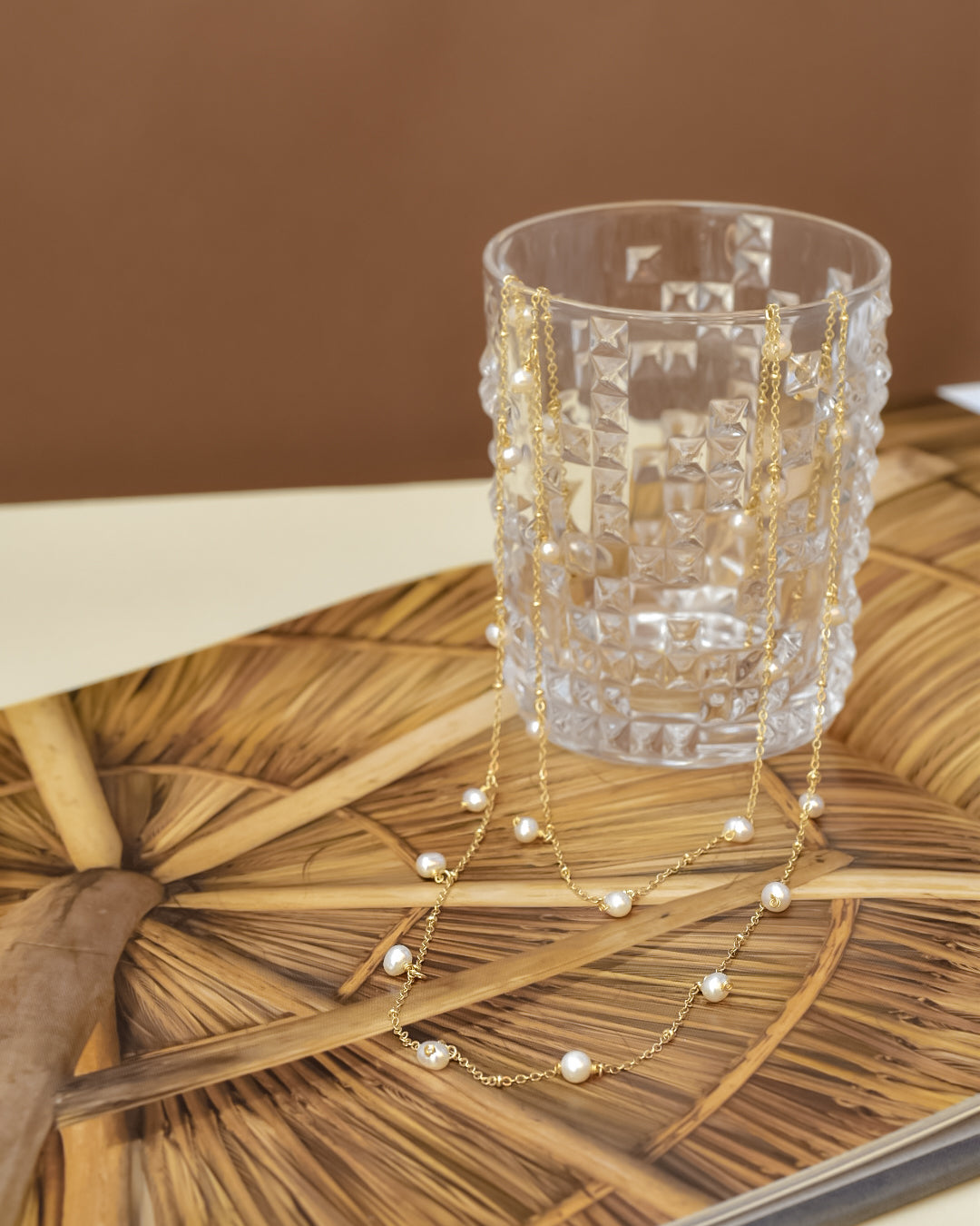CADENA ELABORADA EN BRONCE BAÑADA EN ORO DE 14K. ORNAMENTADA CON PERLAS.
