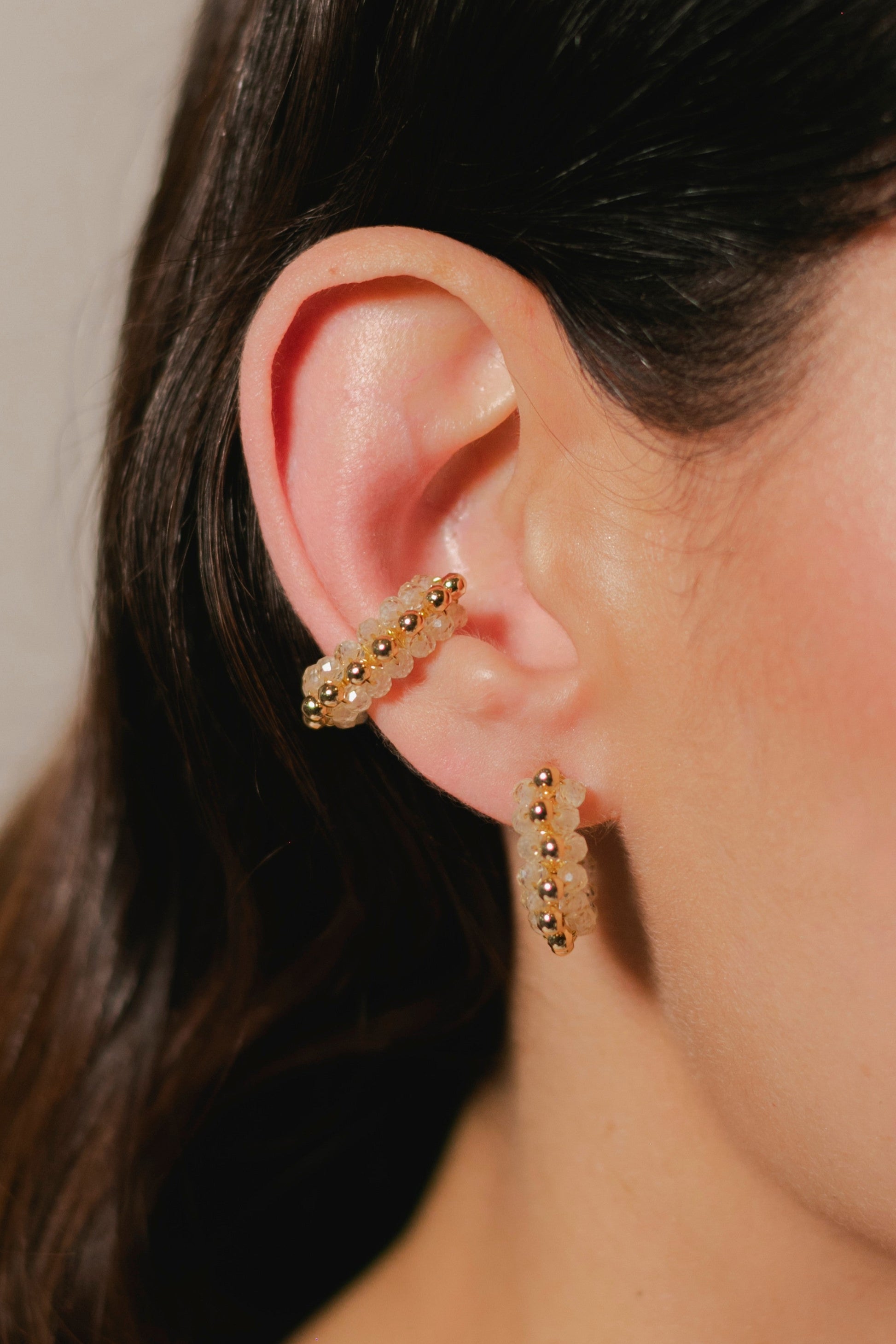 ARO HECHO EN BRONCE BAÑADO EN ORO DE 14K, TEJIDO A MANO CON PIEDRA SEMI PRECIOSA, CUARZO BLANCO.